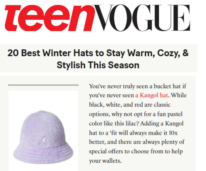Kangol Featured in Teen Vogue by Ryann McDevitt | Jan 29, 2024 | Kangol Teen Vogue featured our Kangol Furgora in the article “20 Best Winter Hats to Stay Warm, Cozy, & Stylish This Season.” Teen Vogue has 7,100,000 unique viewers per month. View the article here: https://www.teenvogue.com/story/best-winter-hats